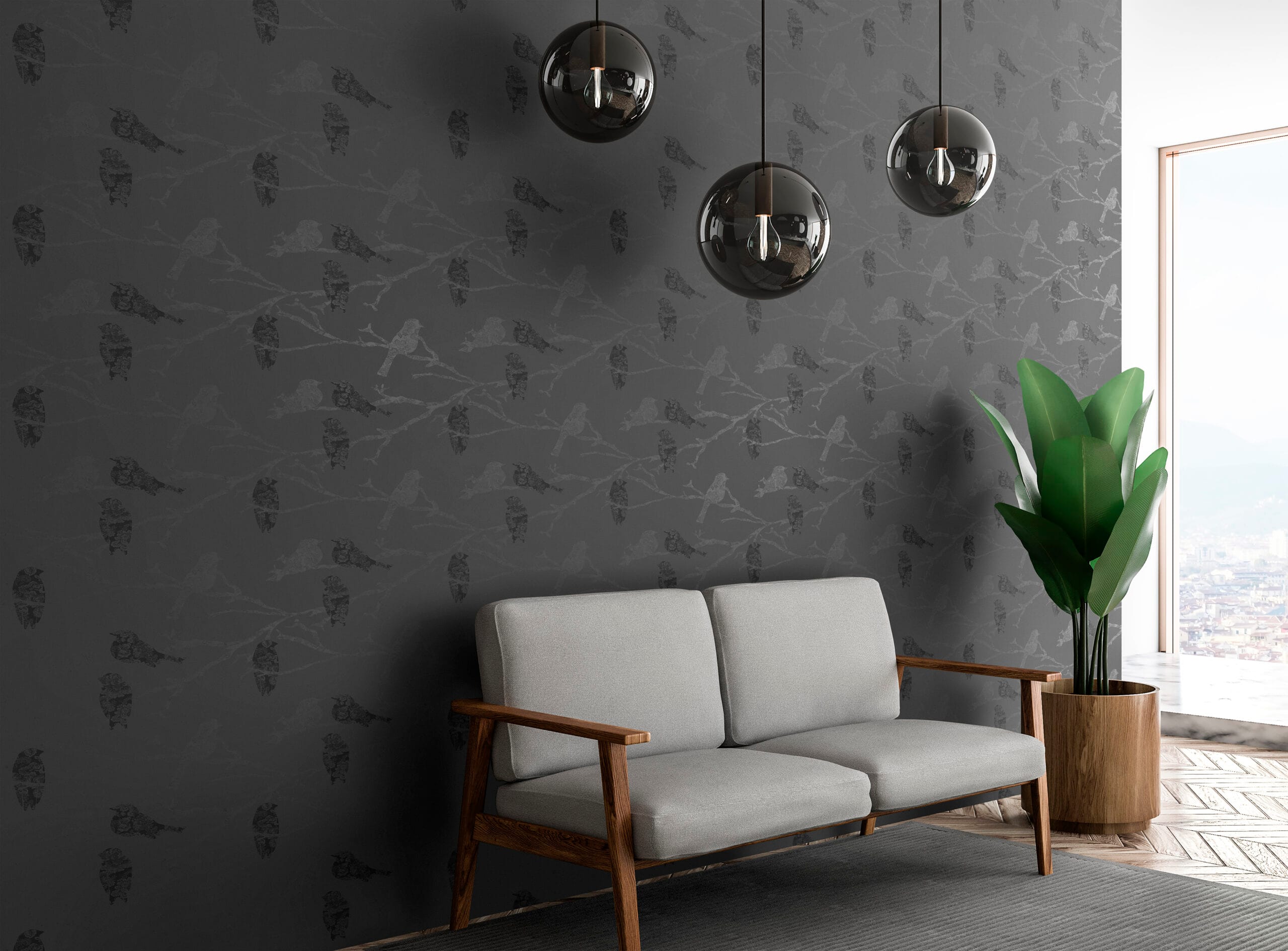 Tämä tyylikäs tapetti yhdistää luonnon rauhan ja urbaanin eleganssin. Hienostuneen harmaalle pohjalle levittäytyvät oksat ja niillä istuvat, kukkakuvioin koristellut linnut luovat tunnelman, joka on yhtä aikaa rauhallinen ja voimakas. Tummat ja hopeanharmaat sävyt tuovat seinään syvyyttä ja hienovaraista kiiltoa, tehden siitä näyttävän mutta hillityn sisustuselementin. Täydellinen valinta tiloihin, joissa halutaan yhdistää rauha, rytmi ja ripaus luksusta.