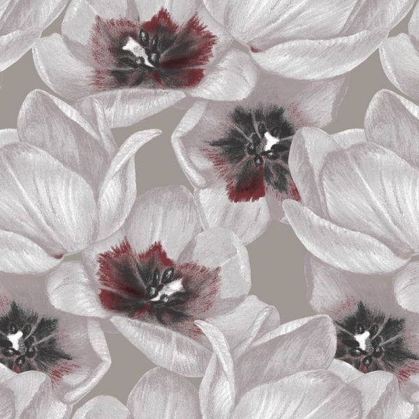 Tämä tapetti tuo sisustukseen näyttävää eleganssia suurikokoisilla kukkakuvioillaan, joissa pehmeän harmaat terälehdet yhdistyvät dramaattisen viininpunaisiin yksityiskohtiin. Hillitty taustasävy korostaa kukkien kolmiulotteisuutta ja tekee pinnasta elävän ja hienostuneen. Täydellinen valinta, kun haluat tuoda huoneeseen ylellistä tunnelmaa ja taiteellista ilmettä ilman, että kokonaisuus tuntuu raskaalta.