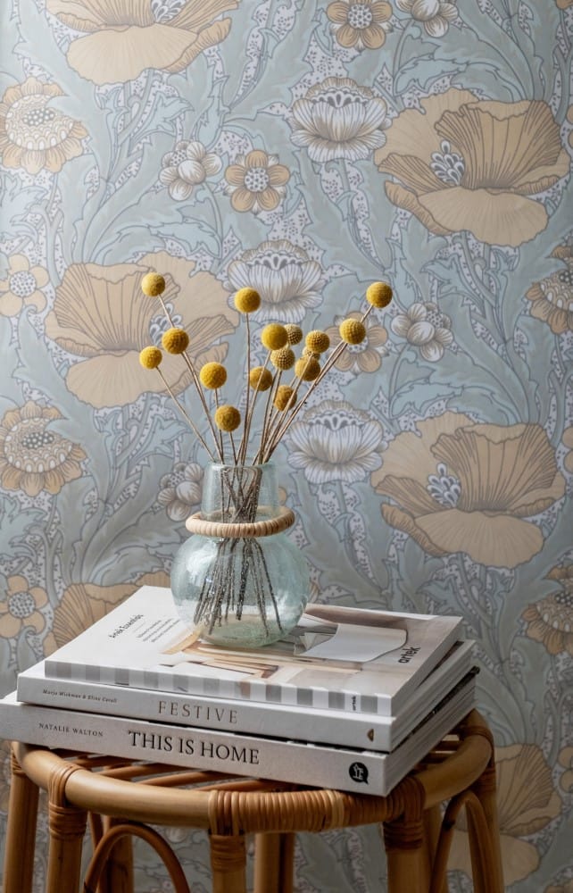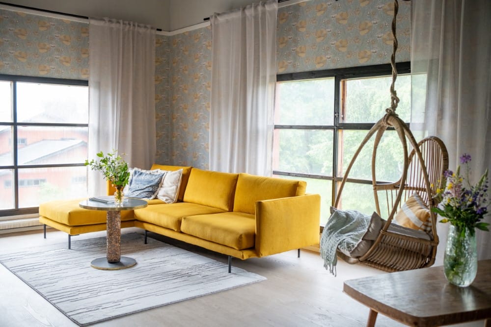Näyttävä kukkatapetti, jossa okrankeltaiset kukat ja vihreät lehdet nousevat esiin hillityn harmaata taustaa vasten. Tässä Unelma-tapetissa yhdistyy klassinen kukkakuosi ja moderni värimaailma. Kuosi tuo tilaan lämpöä ja persoonallista tunnelmaa, ja sopii erityisesti tehosteseinäksi.
