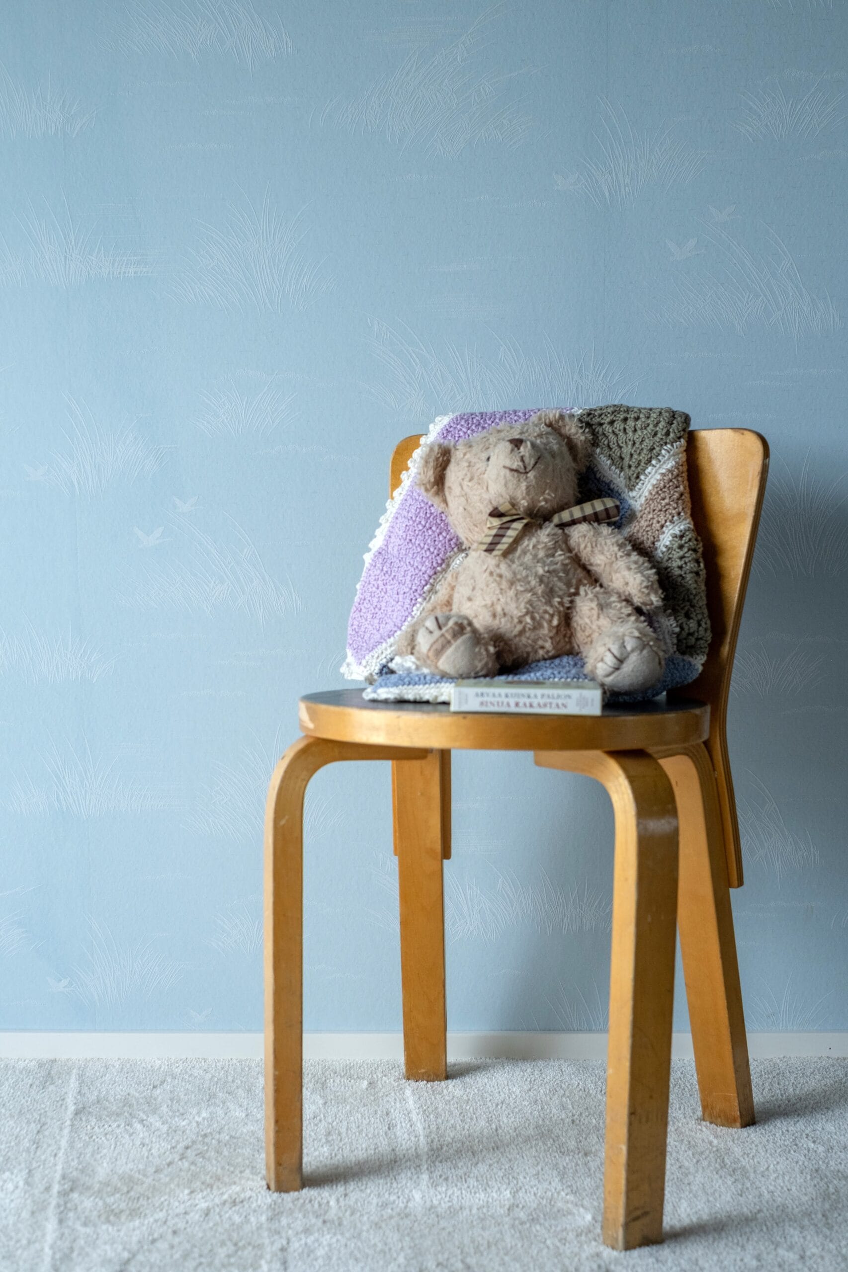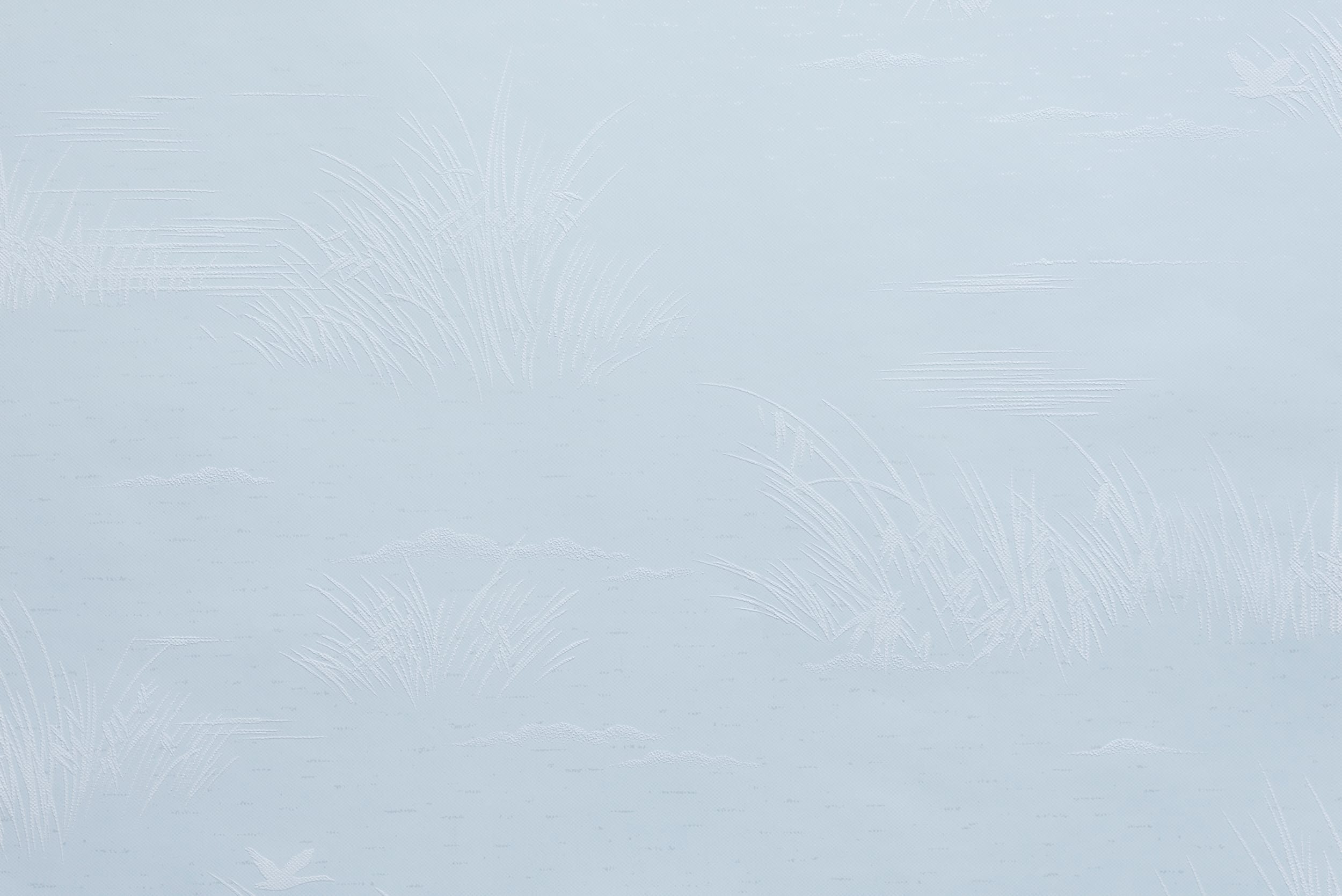 Emma luo ympärilleen rauhallisen rantamaiseman ja hetken, jolloin aika pysähtyy ja voi istua tuijottamassa usvaista järven pintaa. Tapetin sävy on vaaleansininen, kohokuviointi on valkoisella silkkipainatuksella ja taustalla on hentoja, päivänvalossa kauniisti kimmeltäviä aaltoja.