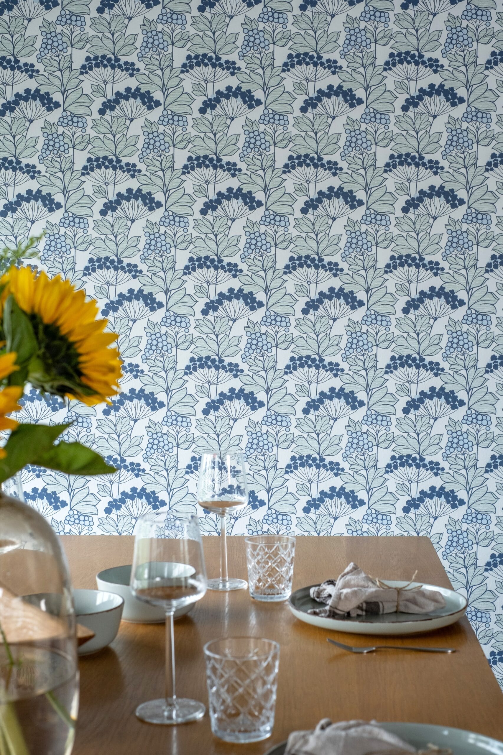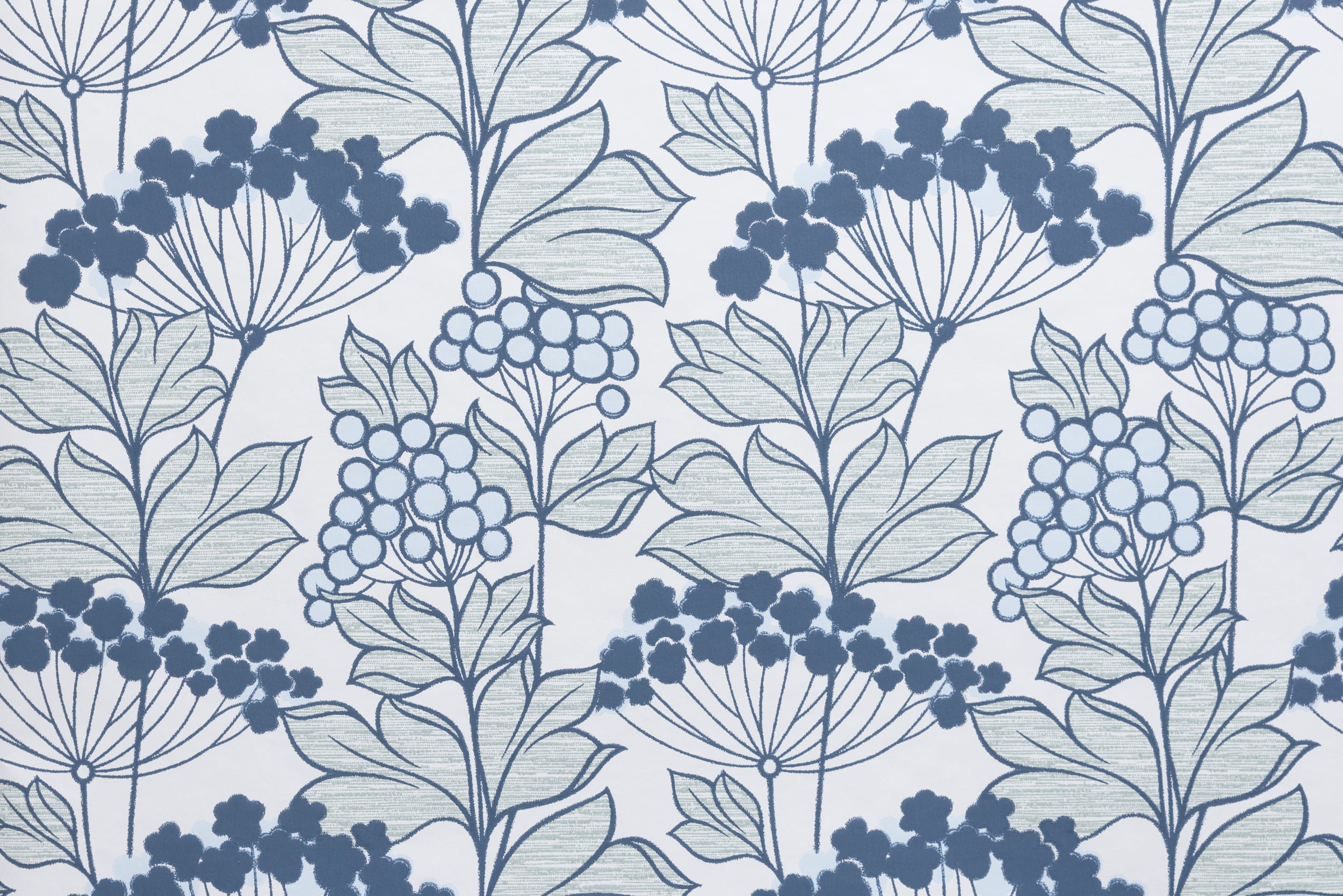 Soili muistuttaa kesäisestä puutarhasta lapsuudenkodin pihassa. Siinä on herkyyttä ja muistoja vuosikymmenten takaa. Tapetissa on vaaleansinisiä marjoja, tummansinisiä kukkia ja vaaleanvihreitä lehtiä valkoisella pohjalla.