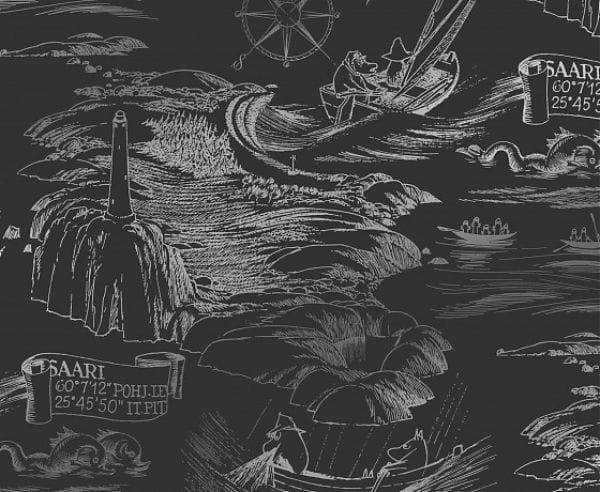 Tämä näyttävä tapetti vie sinut keskelle Muumien seikkailuja myrskyävien aaltojen ja karujen kallioiden maailmaan. Syvä tumma pohja ja herkät hopeiset viivapiirrokset luovat voimakkaan kontrastin, joka tekee tapetista todellisen katseenvangitsijan. Jokainen yksityiskohta kertoo oman tarinansa Muumipapan tutkimusmatkoista ja saariston mystisestä kauneudesta. Tämä tapetti sopii täydellisesti tilaan, jossa halutaan yhdistää rohkeus ja nostalgia – olipa kyse sitten olohuoneesta, työtilasta tai lasten seikkailuhuoneesta. Se kutsuu pysähtymään, unelmoimaan ja heittäytymään mukaan Muumien maailmaan.