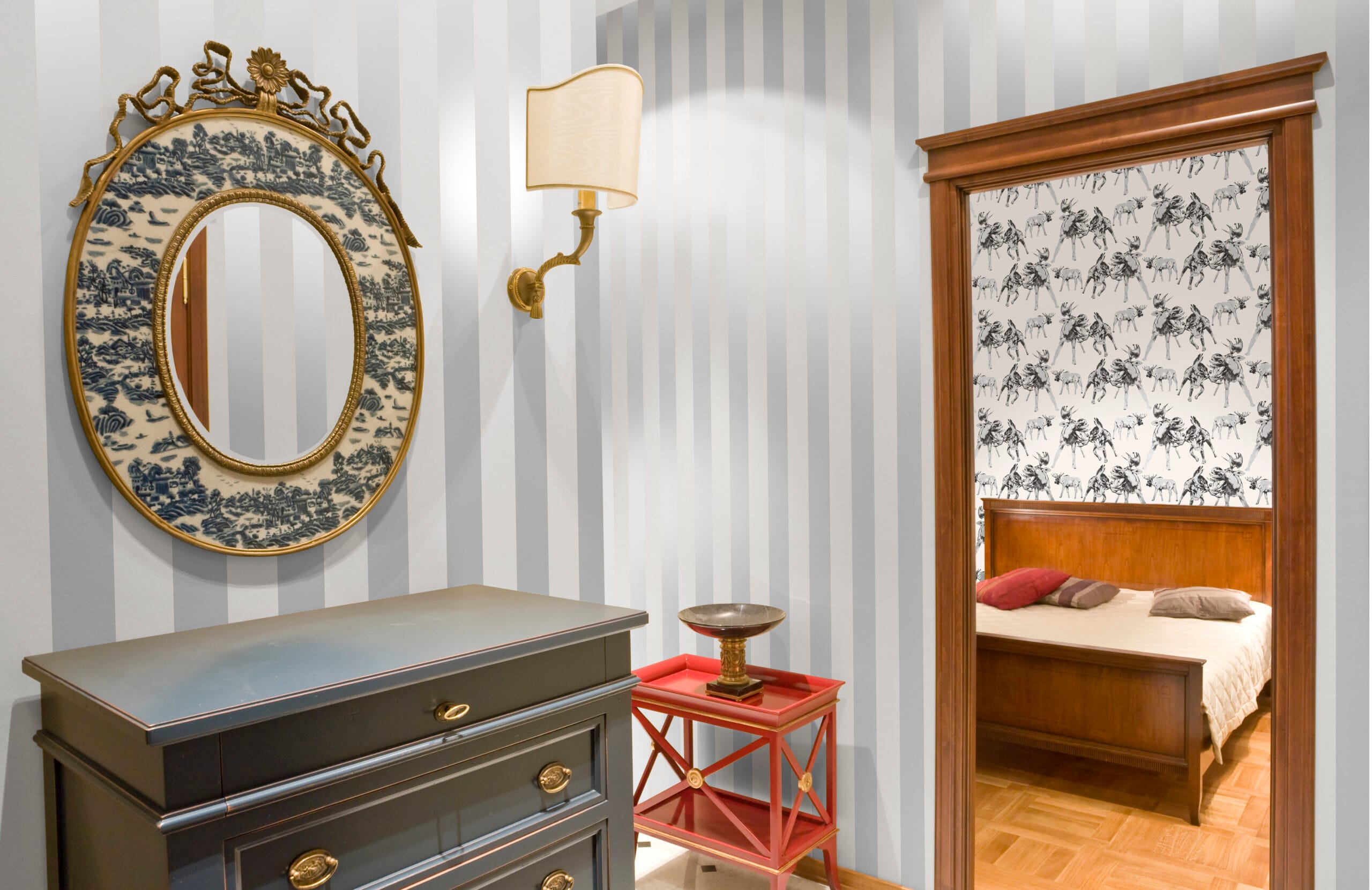 Tämä tapetti tuo tilaan modernin hotelliluksuksen fiiliksen ilman ylimääräistä vaivannäköä. Selkeät, vertikaaliset raidat luovat ryhtiä ja saavat huoneen näyttämään korkeammalta ja avarammalta. Hopean ja valkoisen pehmeä liukuväripinta lisää hienostunutta valonheijastusta – aivan kuin seinään kietoutuisi hillitty metallinhohto.