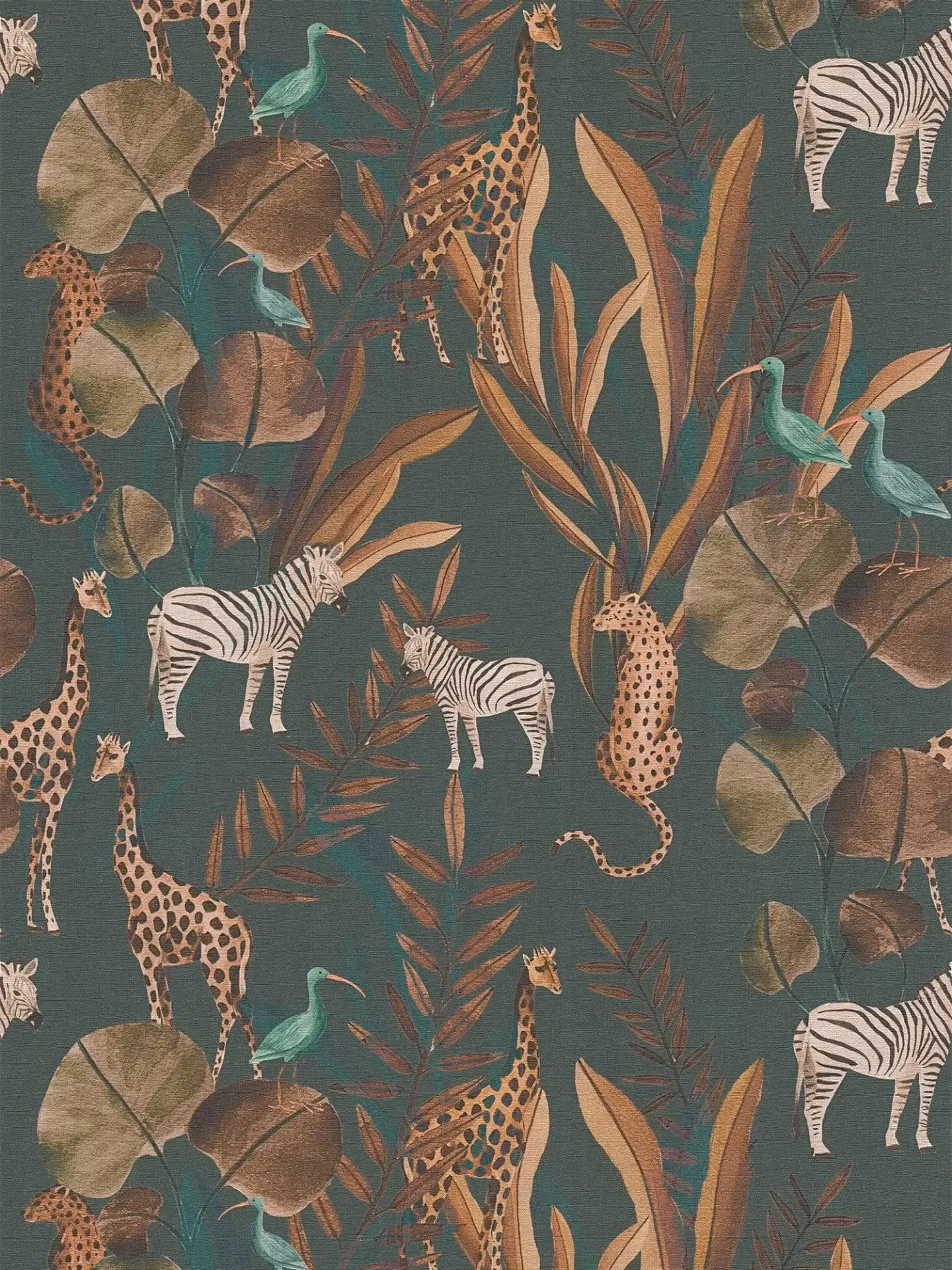 Tämä tapetti vie sinut keskelle salaperäistä viidakkoa, jossa luonnon värit ja villieläimet heräävät eloon. Syvä, tummanvihreä tausta luo näyttävän kontrastin lämpimän kuparinsävyisille kasveille, kirahveille, seeproille ja leopardeille, joita täydentävät elegantit turkoosinsiniset linnut. Kuvio on kuin taideteos. Tapettikuosi on täynnä yksityiskohtia, liikettä ja luonnon rytmiä.