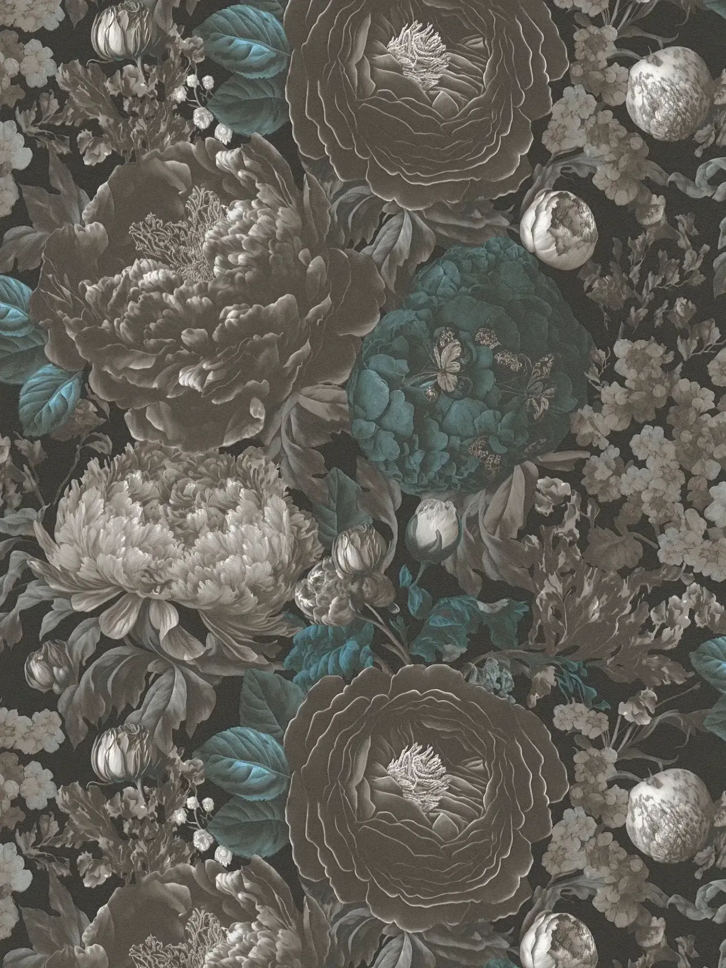 Tämä näyttävä kukkatapetti huokuu ylellistä dramatiikkaa ja ajattoman romanttista tunnelmaa. Syvä tummasävyinen tausta korostaa upeasti suurikokoisia kukintoja, joiden yksityiskohtainen kuviointi ja hienostuneet värisävyt luovat lähes maalauksellisen vaikutelman.