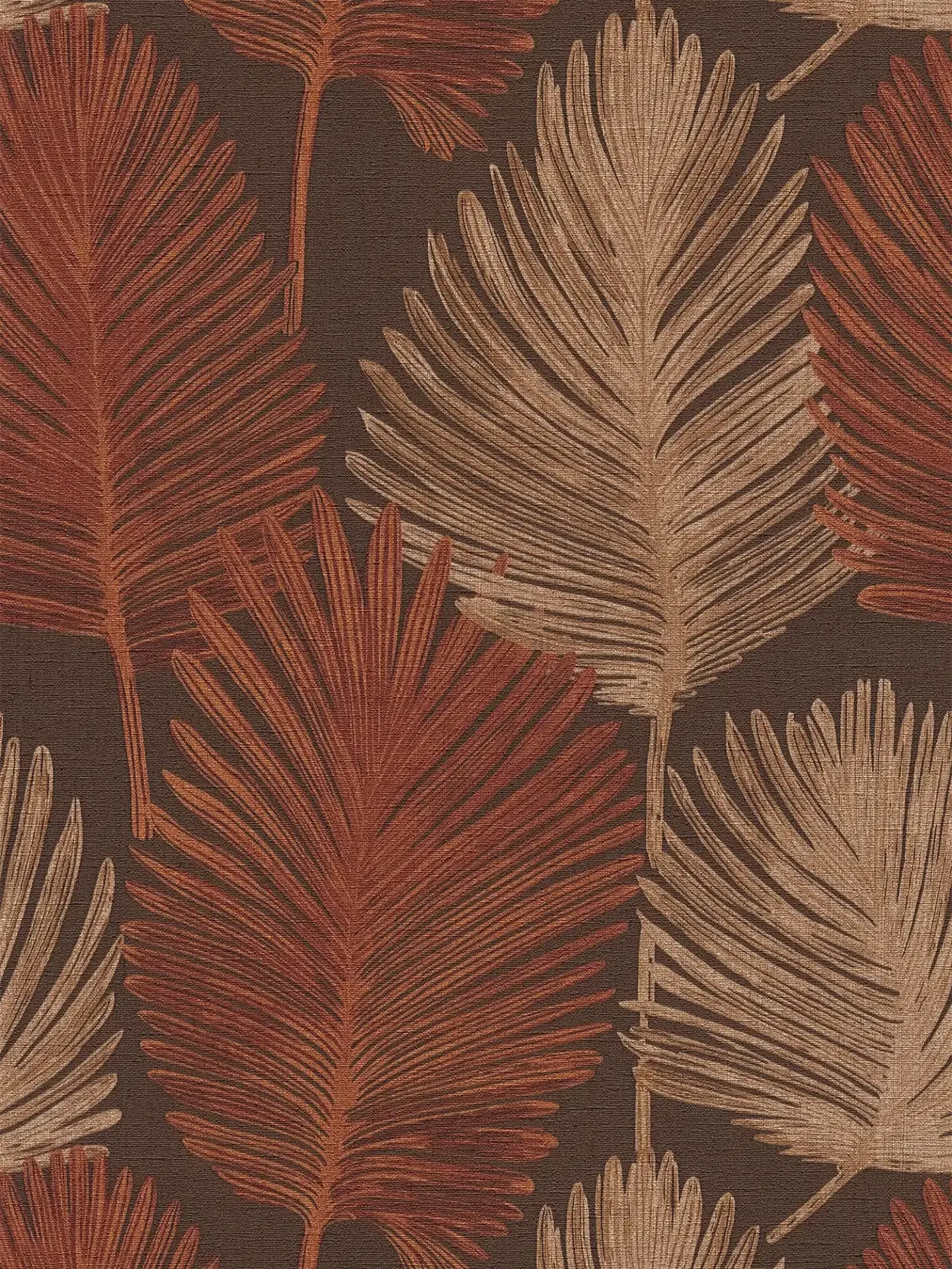 Tämä näyttävä tapetti tuo sisustukseen lämmintä eksoottisuutta ja rohkeaa luonnetta. Syvä suklaanruskea tausta korostaa upeasti poltetun oranssin ja kuparin sävyisiä palmulehtiä, jotka levittäytyvät pinnalle kuin auringonlaskun valossa hehkuva trooppinen metsä.